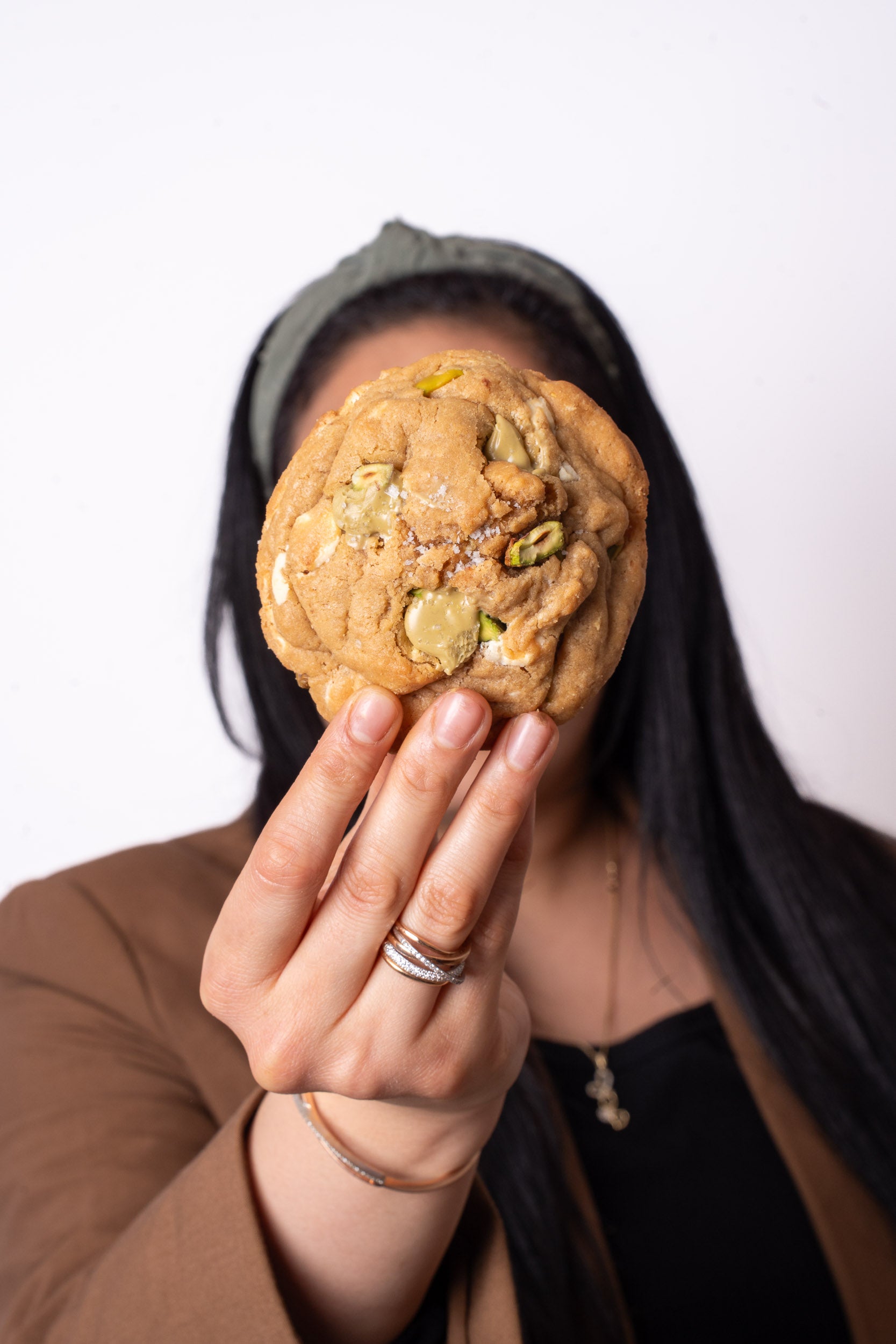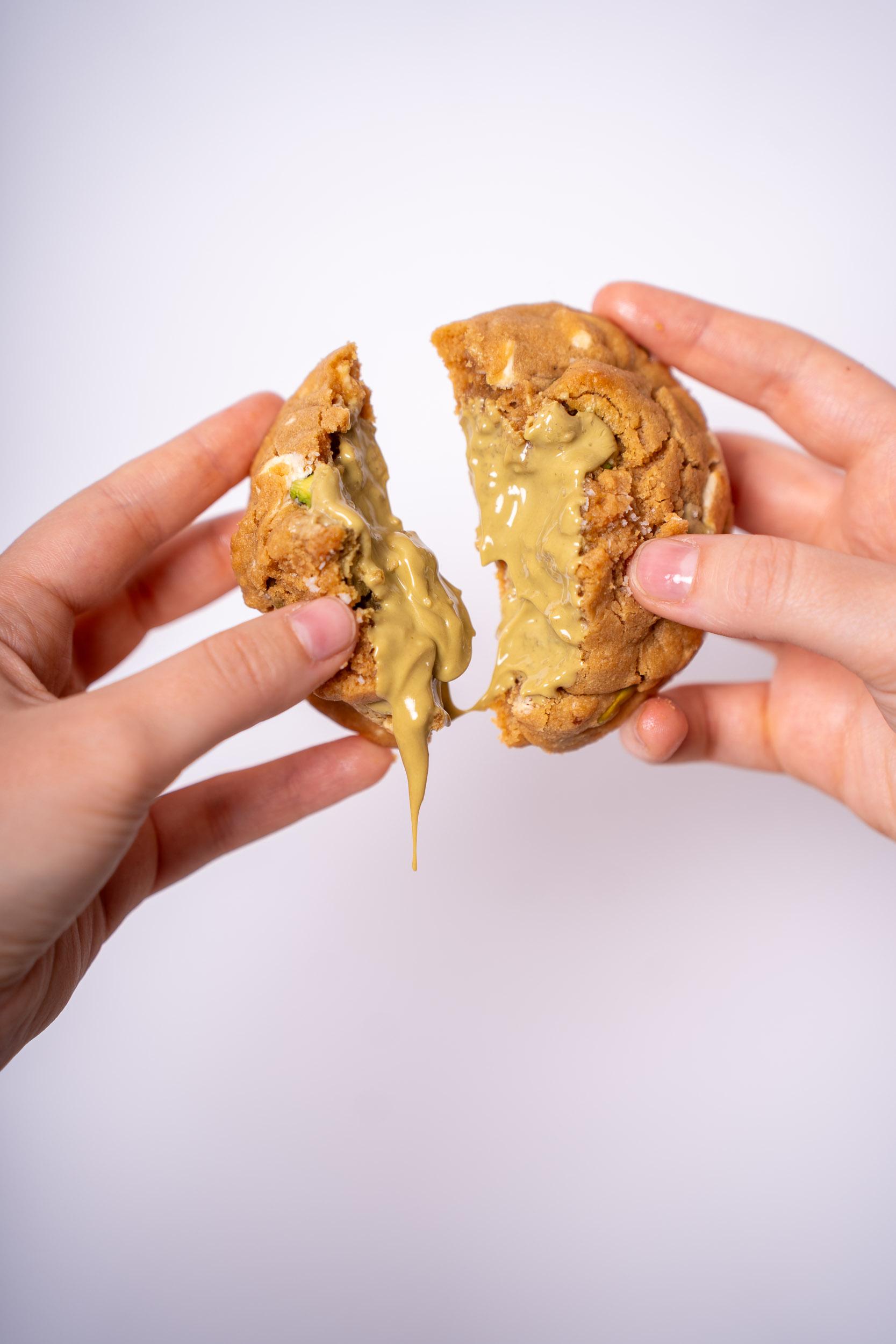 Laissez-vous tenter par ce cookie pistache artisanal, garni de crème de pistache fondante, des pistaches entières et croquantes ainsi que des pépites de chocolat blanc. Le tout relevé d’une touche de fleur de sel, une création unique, savoureuse et parfaitement équilibrée.