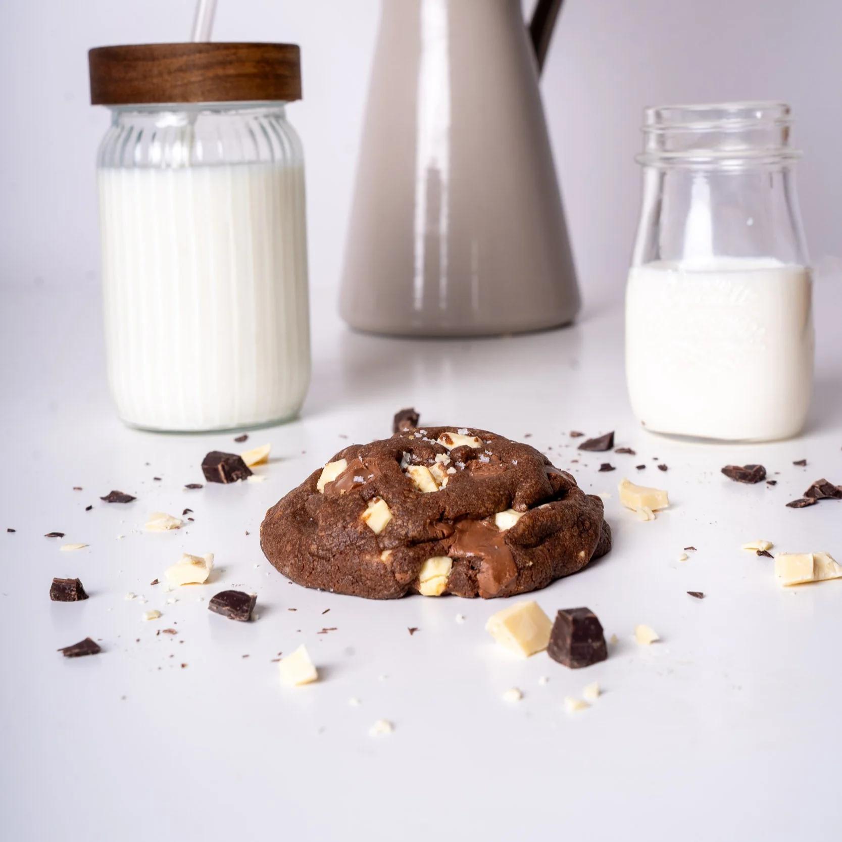 Le cookie des chocovores par excellence ! Une base cacao moelleuse et fondante, enrichie de pépites de chocolat noir, chocolat au lait et chocolat blanc. Ce cookie fait maison ultra gourmand satisfera les envies les plus chocolatées.