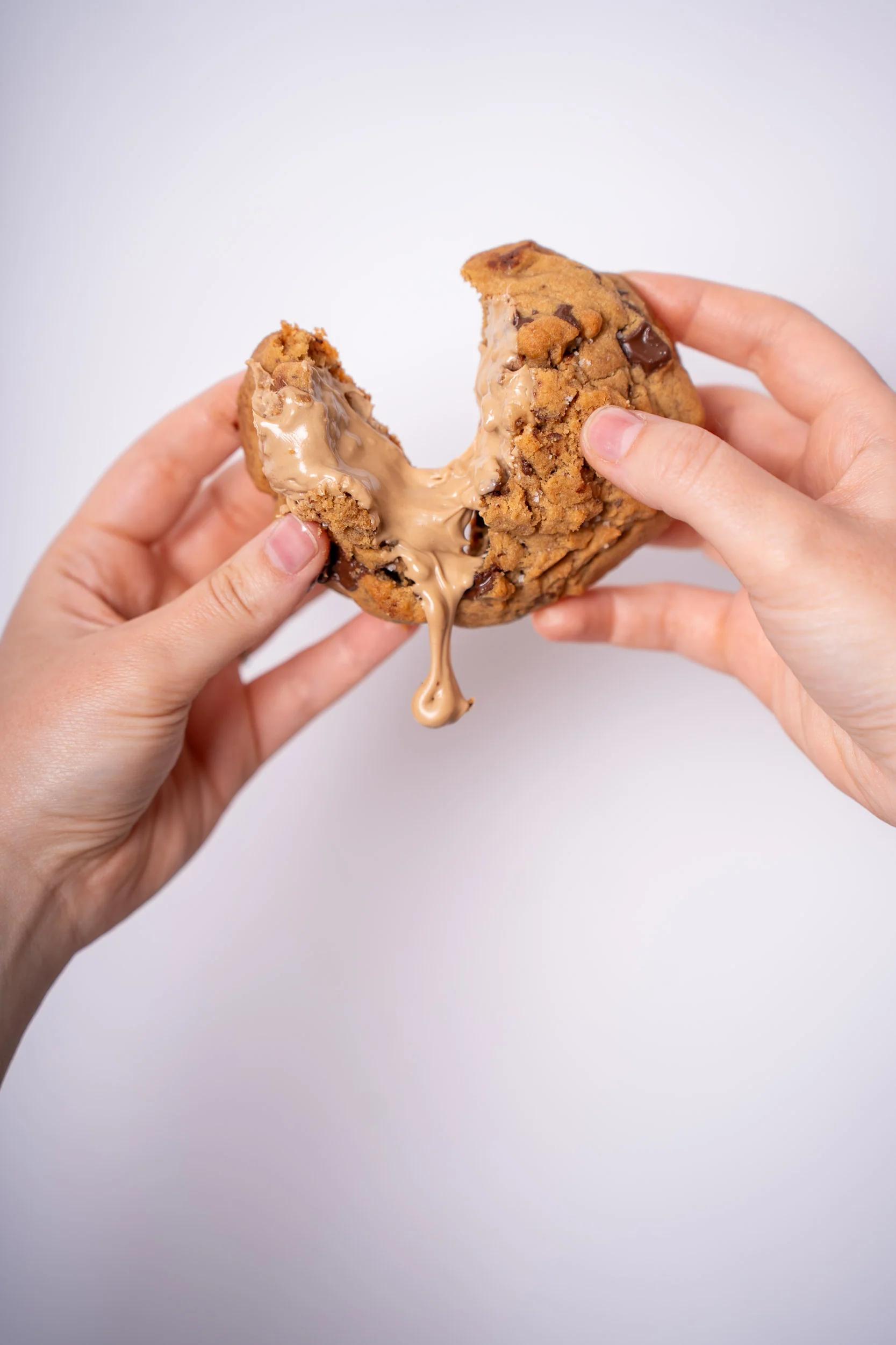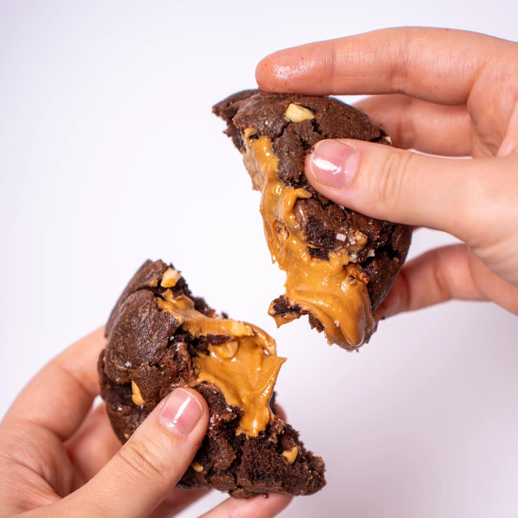 Découvrez notre cookie au beurre de cacahuète, à la base cacao intense. Chaque bouchée révèle le croquant des cacahuètes et un cœur fondant au beurre de cacahuète. Un cookie artisanal puissant, idéal pour les amoureux du peanut butter.